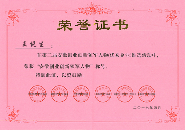 •        經過1個多月如火如荼的評選,第二屆安徽創業創新領軍人物(優秀企業)頒獎盛典于4月23日下午在合肥榮耀啟幕,來自全省的26位企業家和24家企業受到表彰。榮事達水工業公司總經理王悅生榮獲“安徽創業創新領軍人物”稱號,并作為代表發表精彩演講。