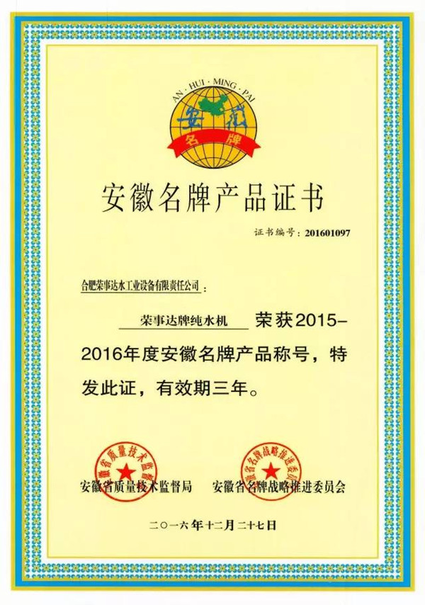 日前,安徽省質(zhì)量技術(shù)監(jiān)督局、安徽省名牌戰(zhàn)略推進(jìn)委員會正式公示2015-2016年度安徽名牌產(chǎn)品榜單,合肥榮事達(dá)水工業(yè)設(shè)備有限責(zé)任公司申報(bào)的“榮事達(dá)牌純水機(jī)”產(chǎn)品榮列榜中,成為安徽凈水行業(yè)首家榮獲省級“名牌產(chǎn)品”稱號的企業(yè),榮事達(dá)水工業(yè)公司強(qiáng)勁實(shí)力再次獲得政府和社會的充分肯定。