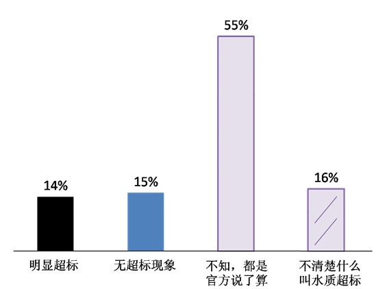 ——對于“水杯里的飲水安全”,只有不到三成的被訪者給了我們“明顯超標”(14%)或“沒有超標現象”(15%)的明確答案。七成被訪者對此一片茫然:55%被訪者表示“不知道,超不超標都是官方說了算”,16%的人甚至“不清楚什么叫水質超標”。