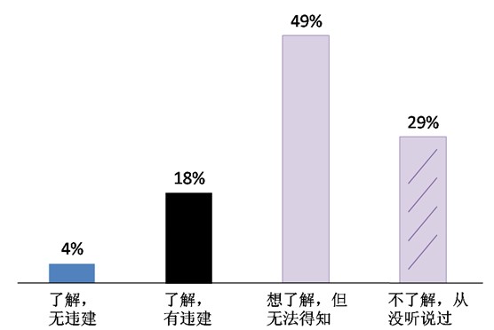 ——對“飲用水水源保護區”這一攸關群眾飲水安全和健康權的規定,只有兩成群眾表示“了解”,并明確地告訴我們“有違建項目”(18%)或“無違建項目”(4%)。八成被訪者對此并不知曉,29%的人“從沒聽說過”,也并沒有想要了解的意愿。半數(49%)被訪者“想了解”,但無奈于“信息不透明,無法得知”。