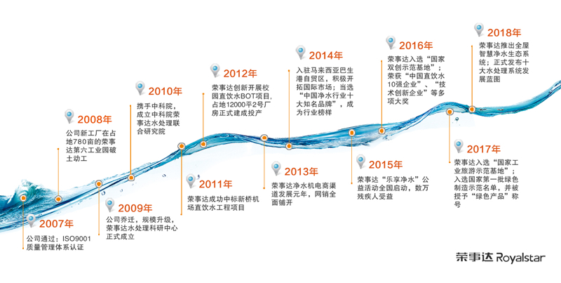2018年5月,榮事達正式發(fā)布十大水處理系統(tǒng)發(fā)展藍圖,全面布局全屋智慧凈水、校園直飲水、城市公共飲水、社區(qū)智慧飲水、農(nóng)村安全飲水、工業(yè)污水處理、生活污水處理、景觀水處理、醫(yī)療用水處理、海水淡化十大領(lǐng)域。
