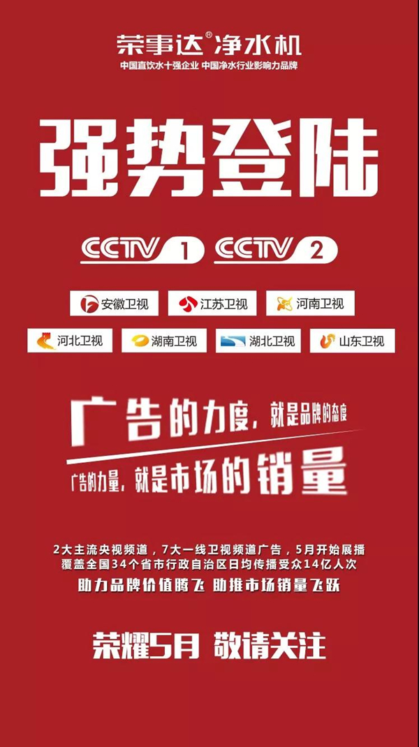 記者了解到,5月下旬,榮事達(dá)凈水機(jī)2018廣告新片將率先登陸CCTV1、CCTV2兩大央視平臺,屆時將向全國觀眾呈現(xiàn)榮事達(dá)獨特的精神理念與品牌形象。