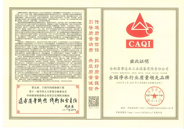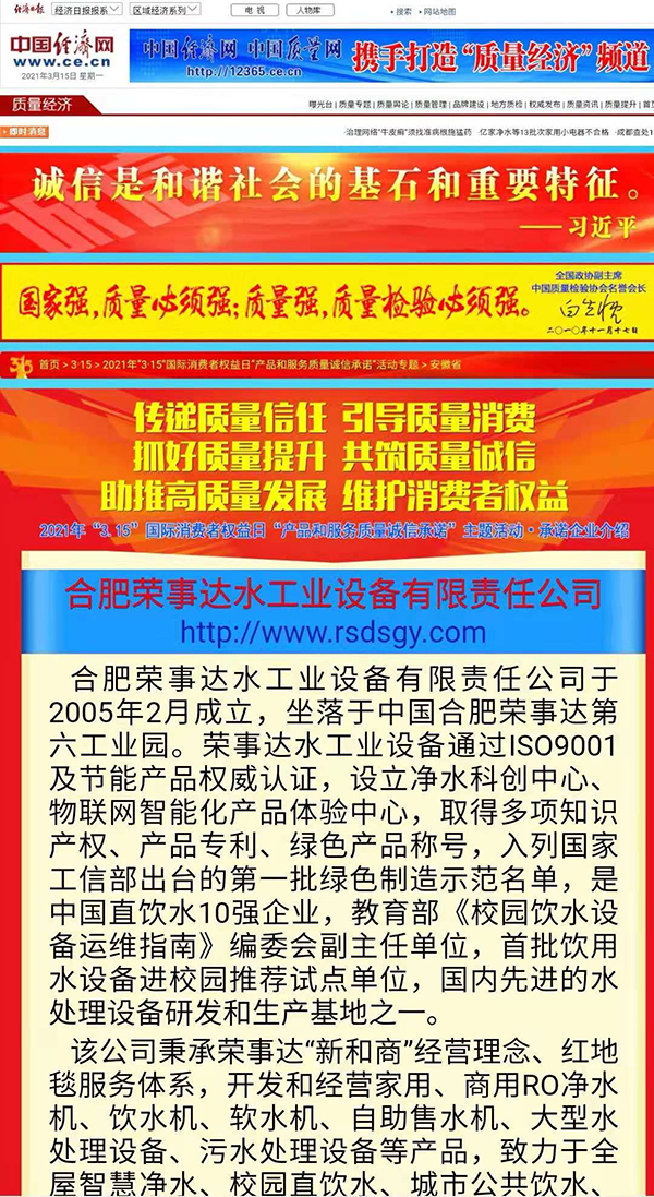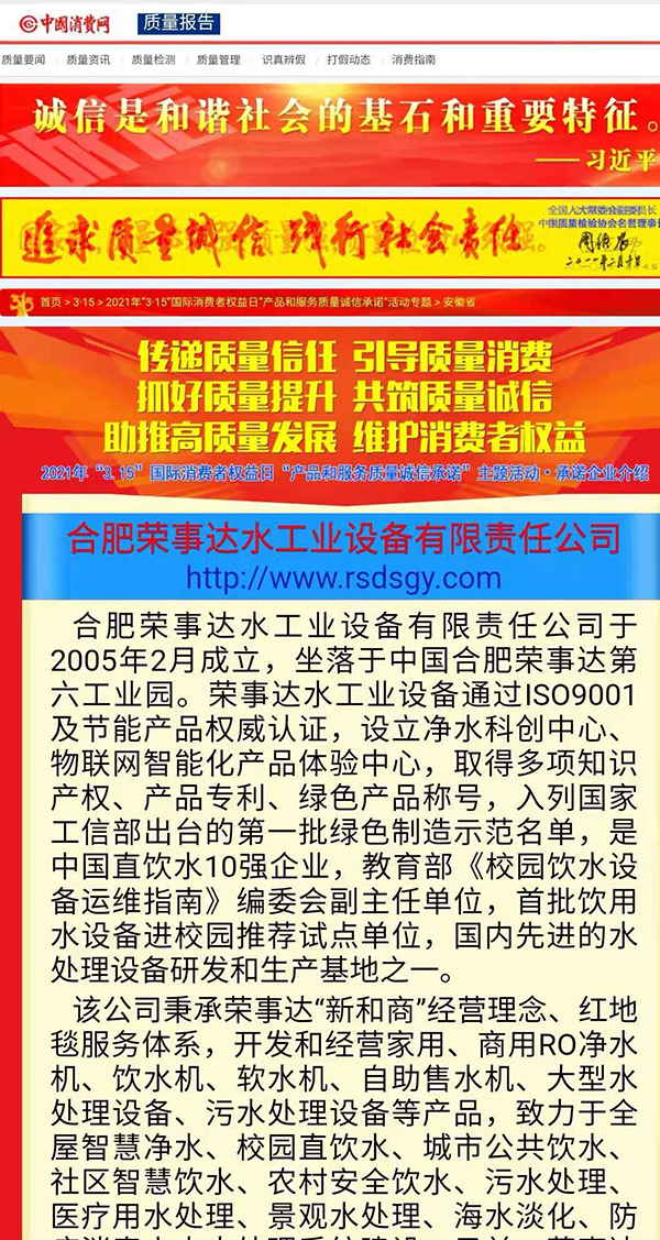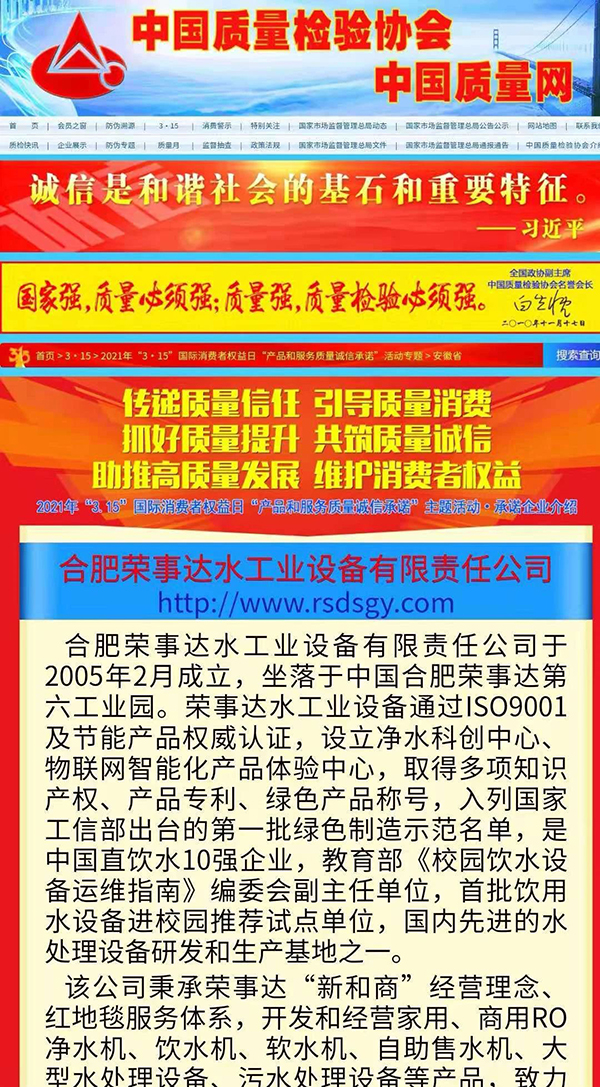 共筑質(zhì)量誠信,引導質(zhì)量消費。在由中國質(zhì)量檢驗協(xié)會主辦的2021年“3.15”產(chǎn)品和服務質(zhì)量誠信承諾的主題活動中,榮事達憑借卓越的產(chǎn)品品質(zhì)及良好的社會形象,獲得協(xié)會以及權威專家的一致認可,榮膺 “全國產(chǎn)品和服務質(zhì)量誠信示范企業(yè)”“全國質(zhì)量信得過產(chǎn)品”“全國凈水行業(yè)質(zhì)量領先品牌” “全國質(zhì)量誠信先進企業(yè)”多項榮譽,《中國質(zhì)量報》、《中國消費者報》及中國質(zhì)量網(wǎng)、中國經(jīng)濟網(wǎng)、中國消費網(wǎng)等多家媒體均予以集中展示和公告。