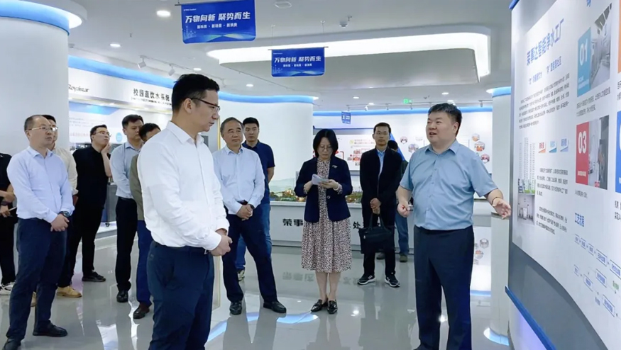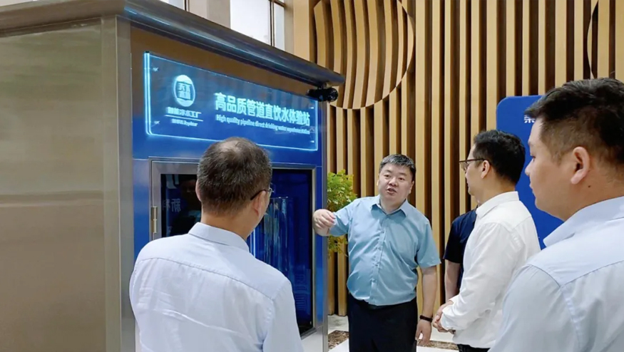 總經理王悅生向領導一行介紹管道直飲水項目:該項目針對社區、學校、醫院、企事業單位及工廠等場景,提供定制化飲水模式,涵蓋社區智慧水站、校園智慧凈水屋、高端直飲水設備及變頻供回水系統,旨在為民眾打造便捷、高端、健康的飲水服務。