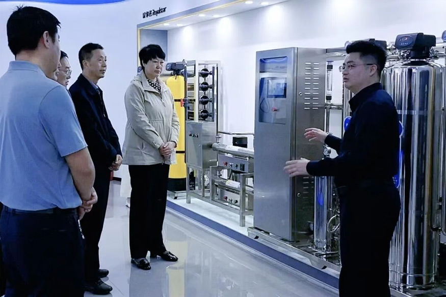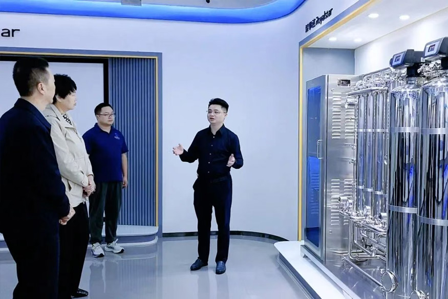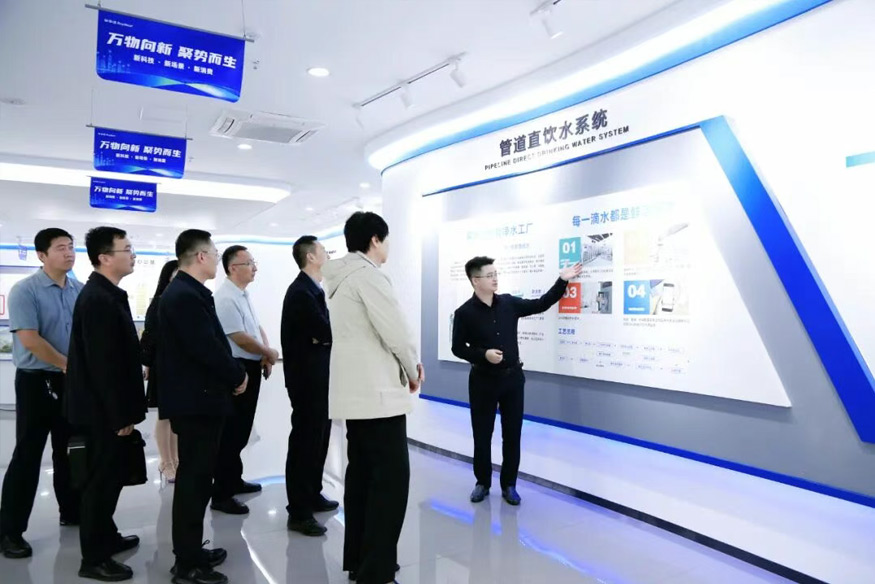 領導一行參觀公司全屋智慧凈水、管道直飲水、校園智慧飲水、單位/工廠直飲水等項目,了解公司在凈水行業全領域的發展情況。